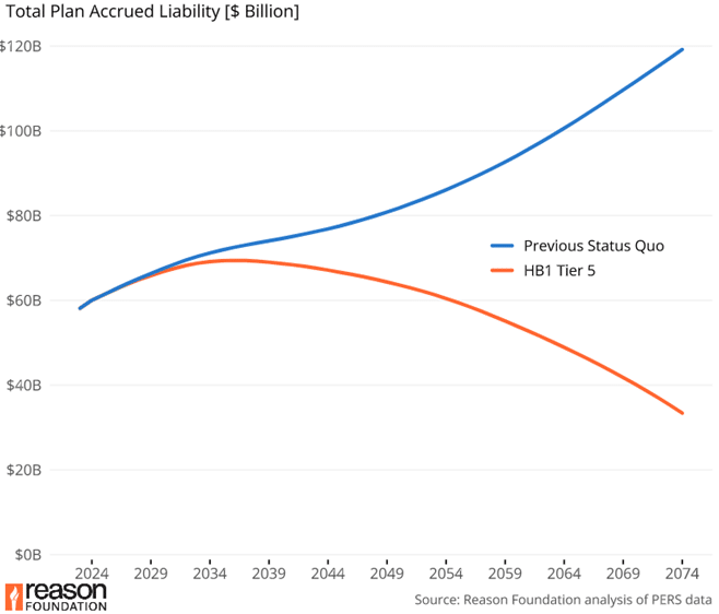 Consistent with the findings shared with the legislature during the 2025 Regular Session, Reason Foundation’s PERS modeling shows the positive long-term impact of Tier 5 and how it reduces future liability accrual by around $80 billion by 2074 (Figure 1).