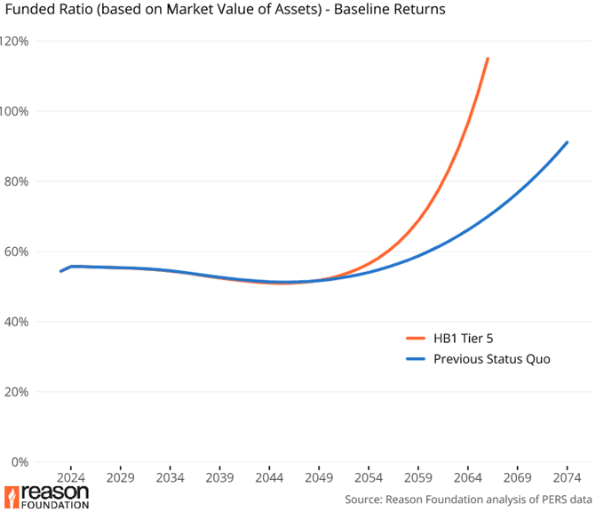 This slowing of liability accrual is one-half of the assets versus liabilities equation upon which PERS is built. Our modeling shows that combining the new benefits with the current statutory funding policy could bring PERS to full funding at least a full decade sooner if market outcomes match plan expectations (Figure 2). If all assumptions prove 100% accurate each year over the next 50 years, and the legislature did nothing more than what it did during the 2025 Regular Session, PERS would reach 80% funded by 2062 and 100% funded in 2065. This has a significant impact on the overall costs for government employers and taxpayers compared to pre-reform.