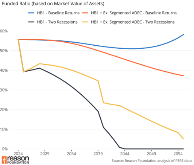 Despite two recessions over the next 50 years, the PERS funding ratio radically decreases without legislative action, but never goes insolvent due to the systematic ADEC funding rates.