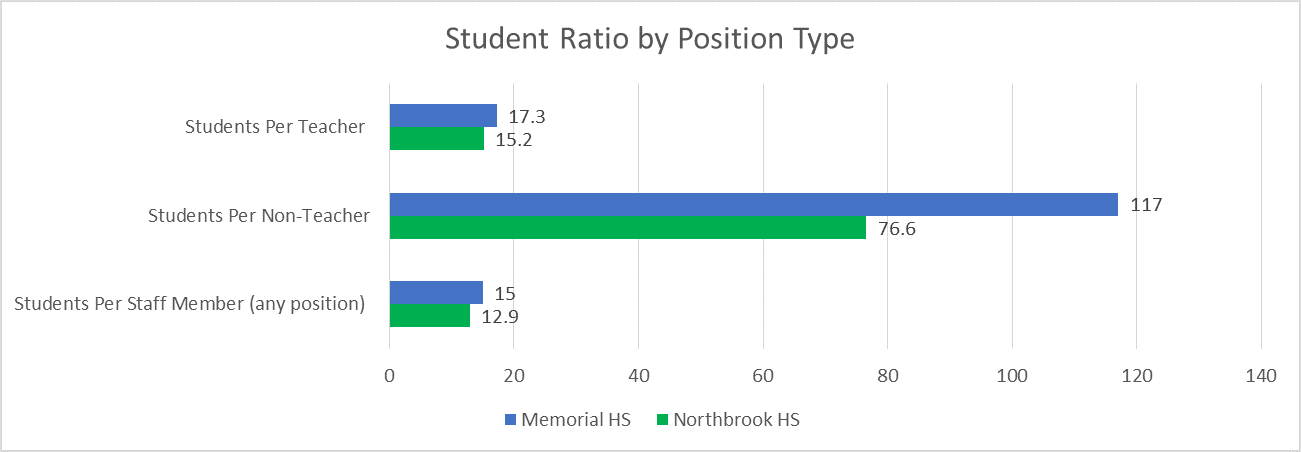 As noted earlier, compared to Memorial High School, NHS spends more money per pupil yet has a less experienced and cheaper staff. So where are its additional resources going? Most are likely distributed through programmatic allotments, such as special education, which are generally quite restrictive in how they’re used. This appears to be mostly in the form of non-teaching staffing allocations as shown in the graph below. Interestingly, NHS spends $417 more per pupil on special education yet $428 less per pupil on regular education than MHS.