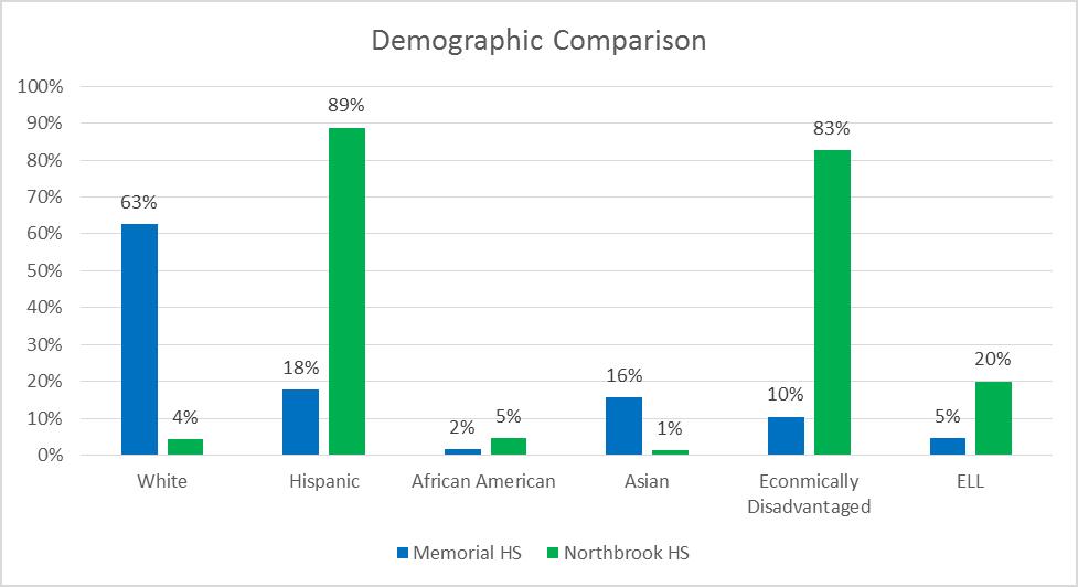 SBID’s Northbrook High School (NHS) and Memorial High School (MHS) are a mere three miles apart yet light-years away in terms of demographics. Although they have similar membership counts of 2,145 and 2,563, respectively, NHS has significantly more economically disadvantaged and English-language learner (ELL) students. These populations generally present greater challenges for educators.