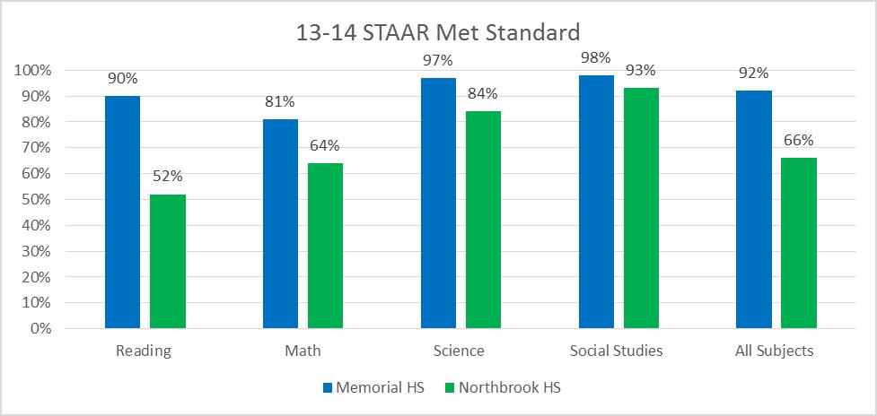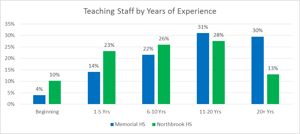 For Spring Branch Independent School District, this plays out precisely as you would expect: Northbrook High School teachers are far less experienced than their counterparts at Memorial High School even though the NHS student population provides greater challenges.