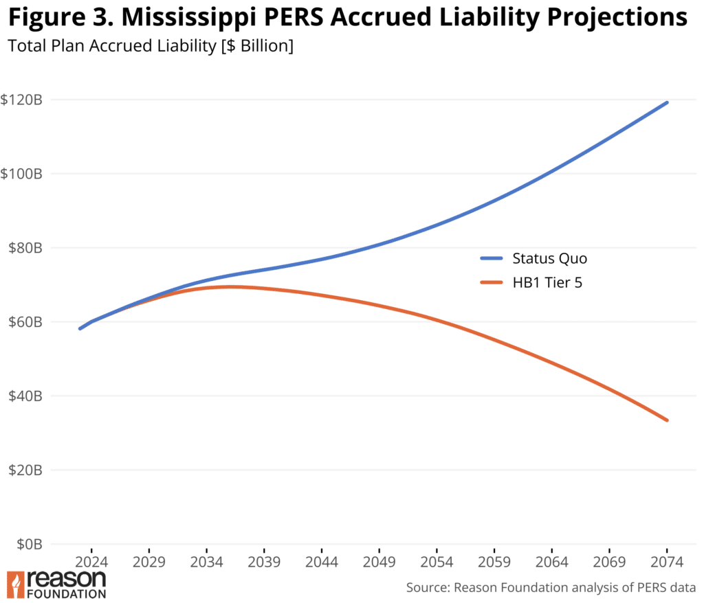 Mississippi’s pension reform aims to bend the PERS liability curve downward by slowing the growth of pension benefit accruals, making it somewhat easier for funding to catch up eventually. Actuarial modeling prepared by the Pension Integrity Project at Reason Foundation indicates that HB1 will likely achieve this goal if actuarial assumptions such as investment return and payroll growth prove accurate.