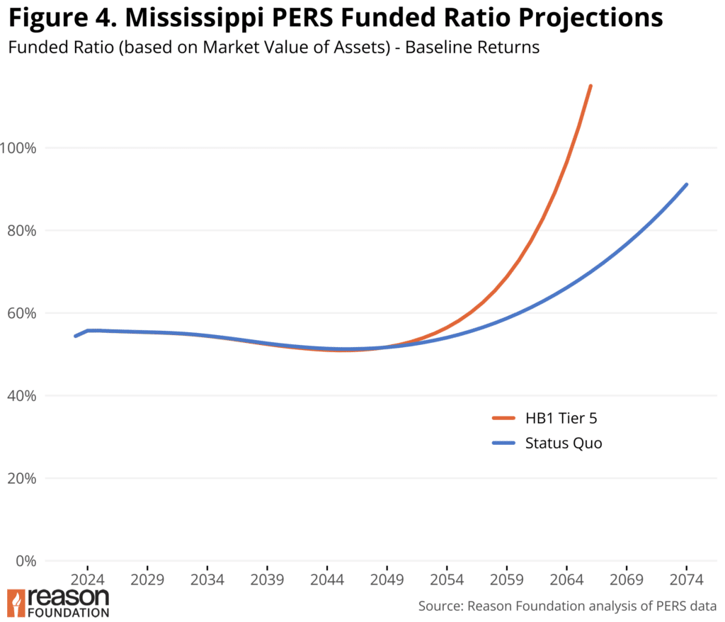 This slowing of liability accrual gives Mississippi a better chance of achieving full funding. Reason modeling shows that the new benefit and funding structure could bring PERS to full funding at least a full decade sooner if market outcomes match plan expectations (Figure 4). This would have a significant impact on the overall costs for government employers and taxpayers.