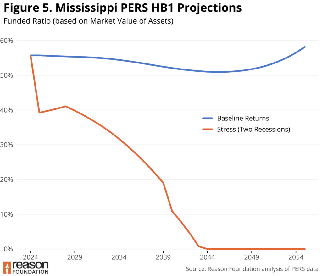 Mississippi policymakers should be warned that, while this reform does reduce long-term costs, it is not projected to reduce the chances of PERS becoming insolvent and exhausting all assets. Figure 5 shows the projected funded ratio of the reformed system, both under a scenario of 7% annual returns and one that involves two recessions and returns below expectations (6%). Comparing these outcomes to the pre-reformed system (Figure 2), a less-than-ideal investment outcome still results in plummeting and eventual exhaustion of funding. HB1 has not eliminated the danger of insolvency facing PERS, which must be addressed in future reforms.