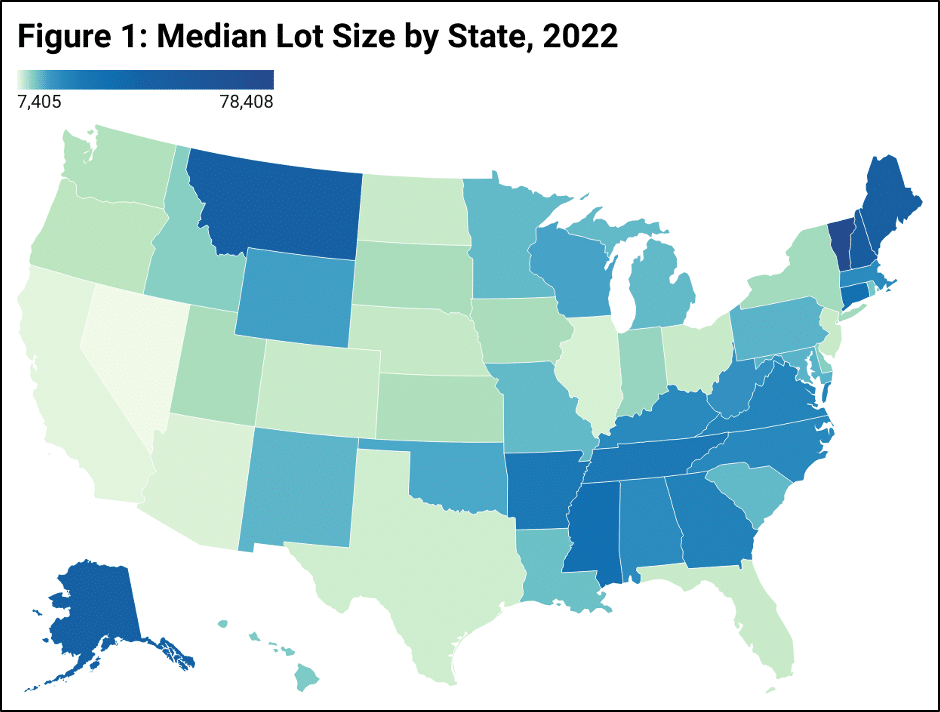 Figure 1 depicts the median lot size in each state. One influence is the environment and nature preservation. Nevada, which has the lowest median lot size, is largely uninhabitable, with development concentrated around cities and necessitating more efficient use of space. However, in less environmentally constrained areas, local land-use regulations play a significant role in determining lot sizes. Vermont combines extensive land conservation with some of the most stringent MLS requirements in the country, designed to preserve its rural character. The Northeastern Vermont Developments Association, for example, mandates an acre lot for every family as the densest option.