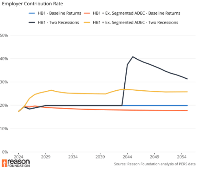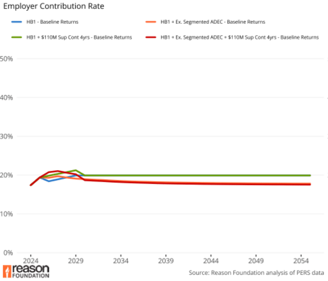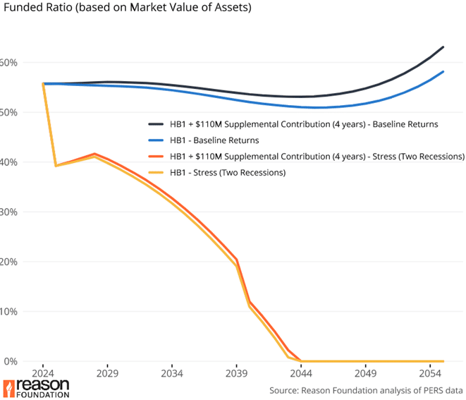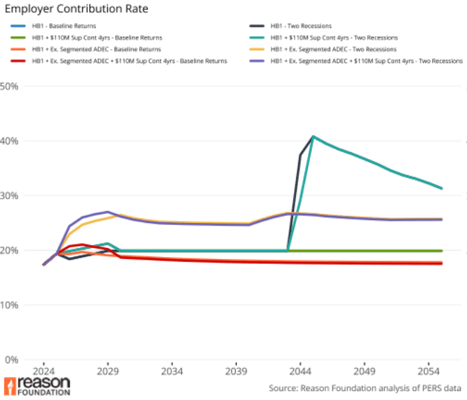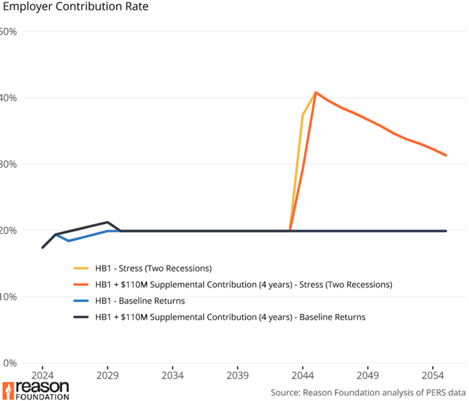 Unless legislators aim to appropriate hundreds of millions annually over the next 30 years to supplement the current fixed employer contribution rate, our modeling finds minimal fiscal gain will be achieved through supplemental contributions, both due to the sheer scale of the plan’s liabilities and PERS’ lack of responsiveness to market downturns.