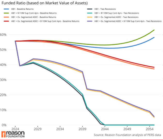 Other states have deployed various mechanisms to overcome public pension underfunding, including layering amortization schedules and applying regular supplemental payments. Any plan facing unfunded liabilities will see significant long-term improvements and taxpayer savings from earlier additional funding. For example, Reason’s modeling indicates that an additional $110 million contributed annually over the next four years to PERS would reduce the time required to eliminate the state’s pension debt by about five years. (Figure 4)