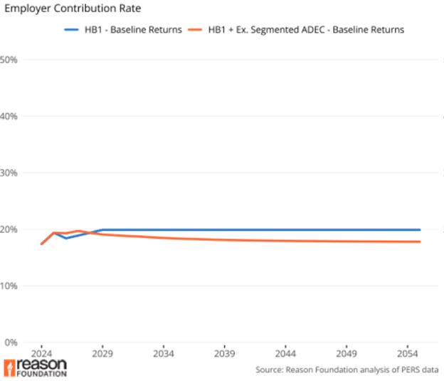 Some states (Louisiana and Connecticut, for example) have set in law that a certain percentage of surplus funds must be allocated toward the reduction of unfunded pension obligations. Others have directed volatile and non-recurring revenue to special funds designed to help pay down pension debt. Earmarking future surplus funds to pay off pension debt is a clear policy that perpetually sets the honoring of pension obligations as one of the state’s highest priorities, while requiring no up-front costs on already cash-strapped government employers. This practice can be capped by only covering any difference between the actuarially determined employer contribution rate and the PERS employer rate set in statute, but lawmakers should know that any amount contributed above ADEC will save taxpayers in the long run and accelerate the pension’s path to full funding.