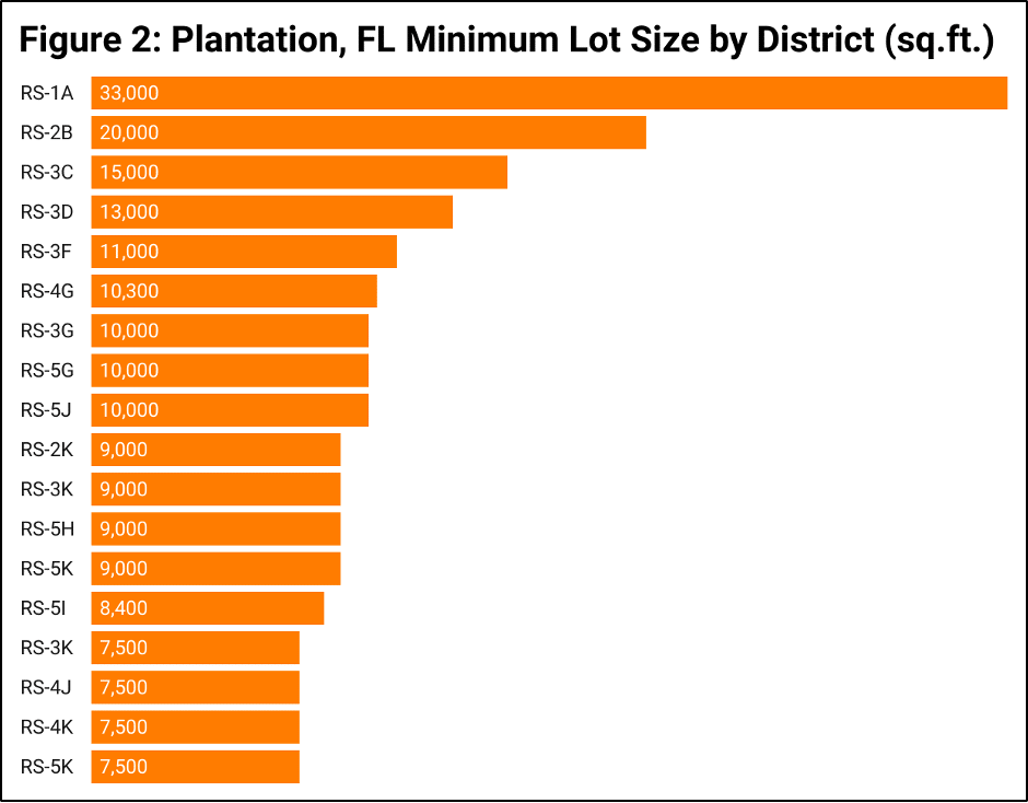 Often, MLS requirements vary significantly on a granular level. Let’s consider just one state. Florida has a wide range of minimum lot size requirements, determined either at the county or city level. Figure 2 shows the minimum lot sizes in a single city, Plantation, with just over 100,000 residents.