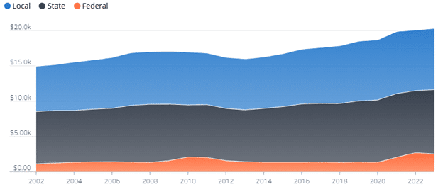 Between 2002 and 2023, public school funding rose by 35.8% from $14,969 per student to $20,322 per student after adjusting for inflation. New York now spends $36,976 per student followed by New Jersey at $30,267 per student, and funding now exceeds $25,000 per student in eight states, including: Vermont ($29,169 per student), Connecticut ($28,975), Pennsylvania ($26,242), California ($25,941), Rhode Island ($25,709), and Hawaii ($25,485).